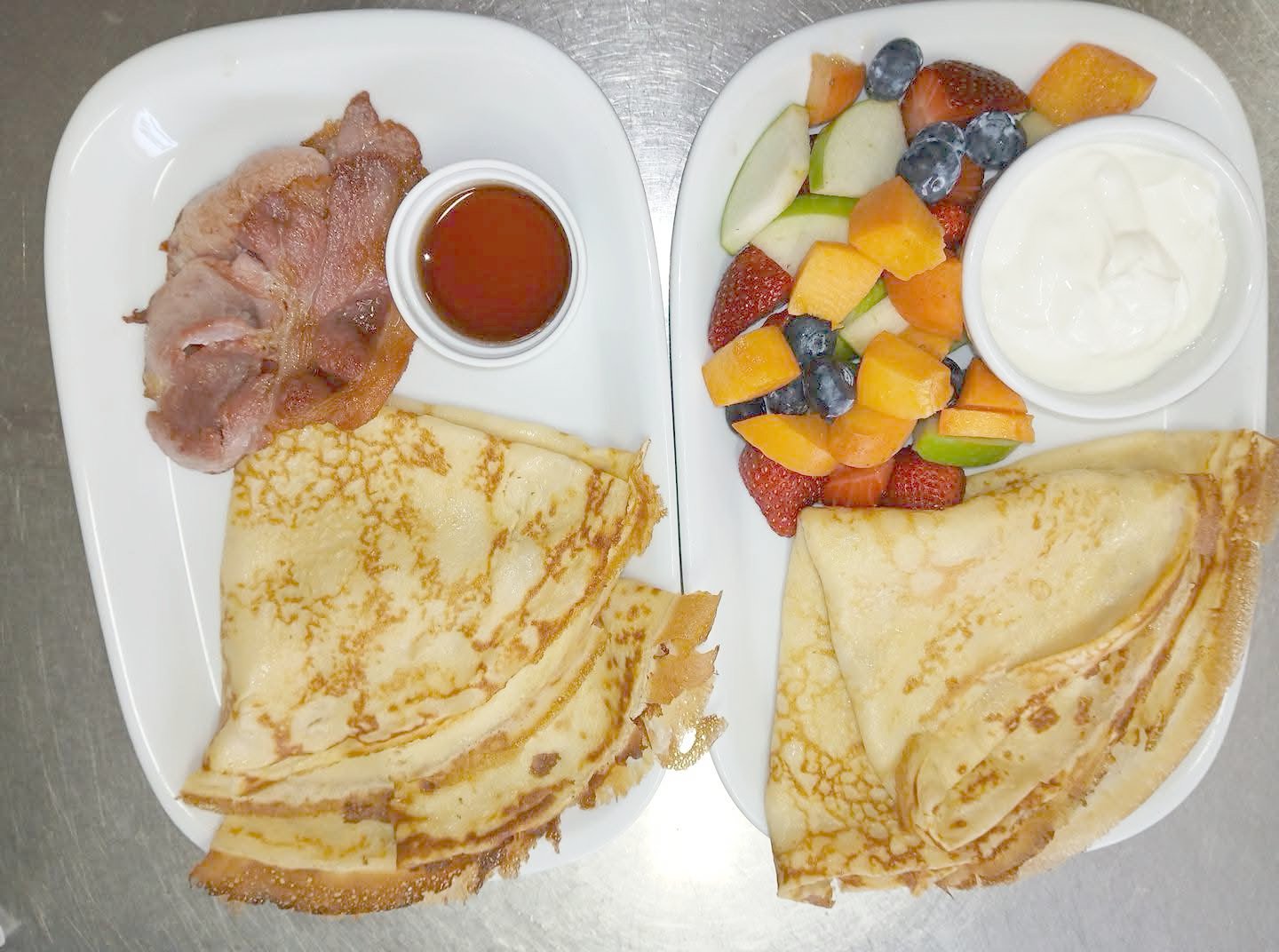🇬🇧 2 x Pancakes served with 2 x bacon + maple syrup, or with fruits + yogurt & nuts – add your favourite extras from a wide selection of fillings and toppings.
