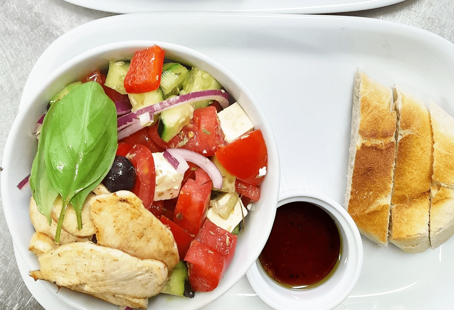🇩🇪 Feta-Käse, Oliven, Gurke, Paprika, rote Zwiebeln, Oregano, Tomaten und Balsamico-Dressing.