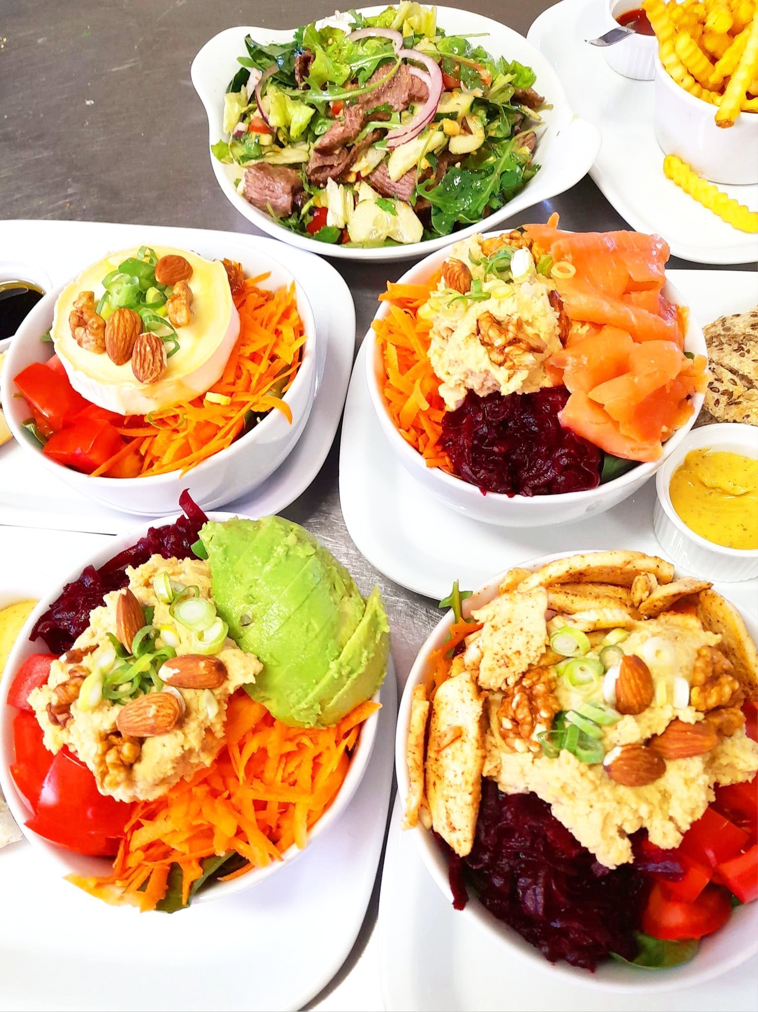 🇩🇪 Hausgemachter Hummus, Karotten, Rote Beete, Tomaten, Frühlingszwiebeln, gemischte Nüsse und Balsamico-Dressing.