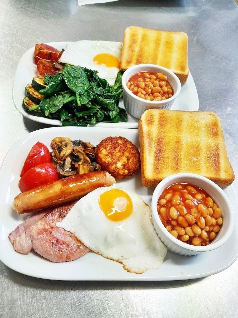 🇬🇧 Sautéed spinach, tomato, mushrooms, baked beans, 1 fried egg, and 1 buttered toast. Gluten-Free.